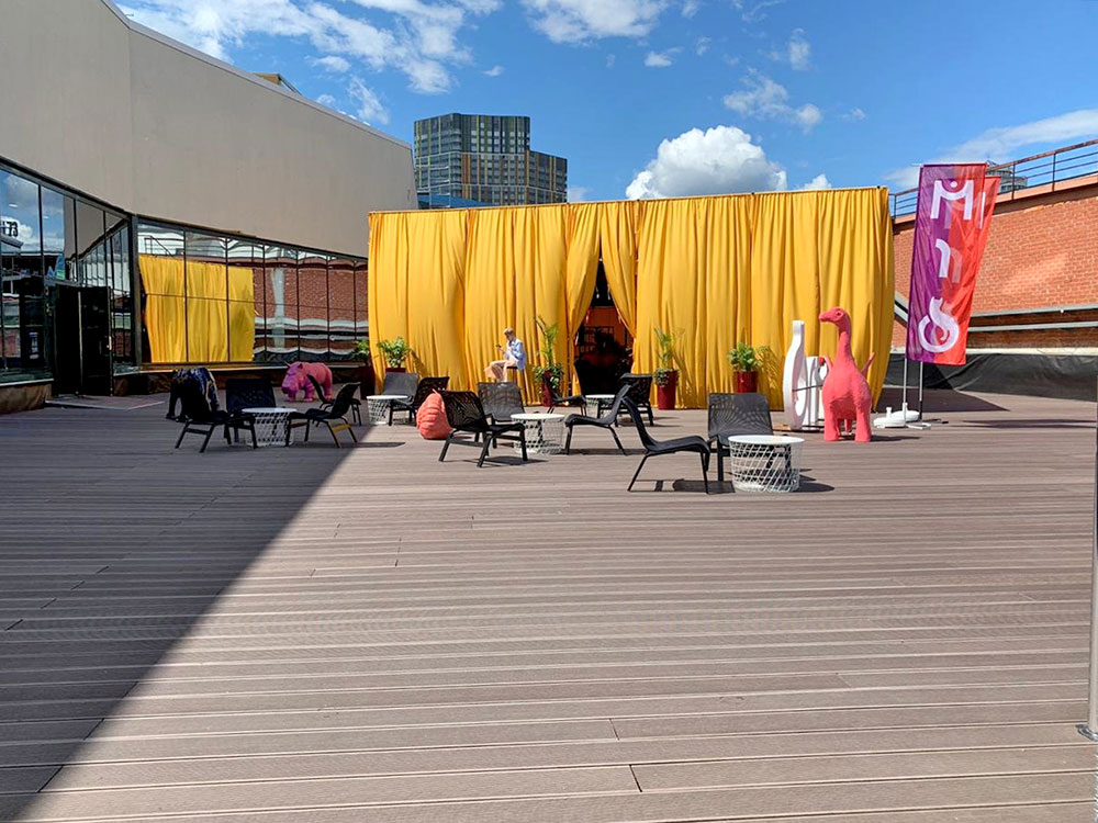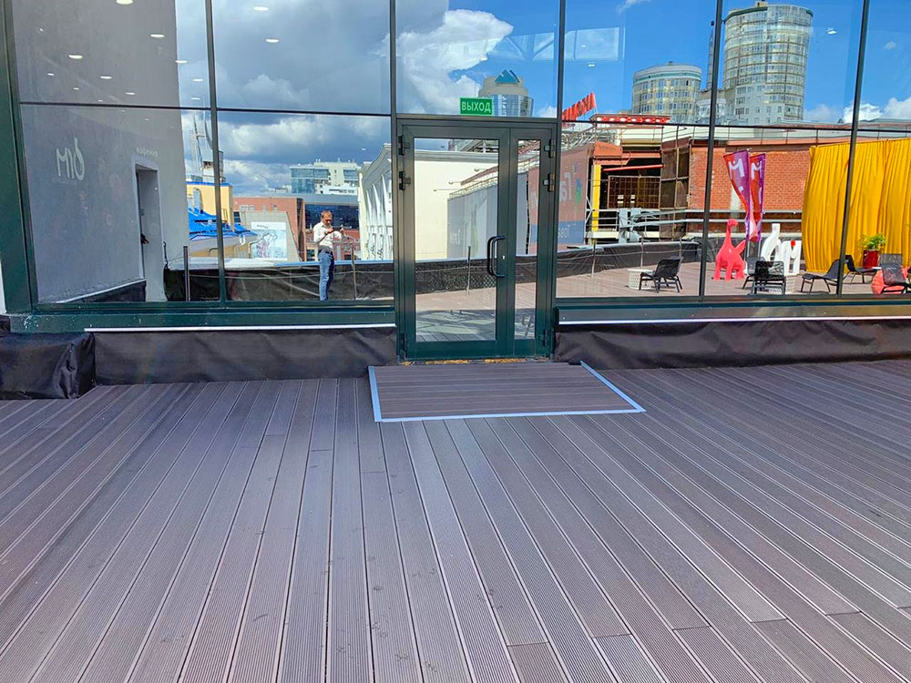 И как вариант напольного покрытия для террасы, обратите внимание на доску из ДПК DECKRON, Доска с семью ребрами жесткости и с зауженными швами, что не дает проваливаться каблукам и шпилькам ваших прекрасных посетительниц.