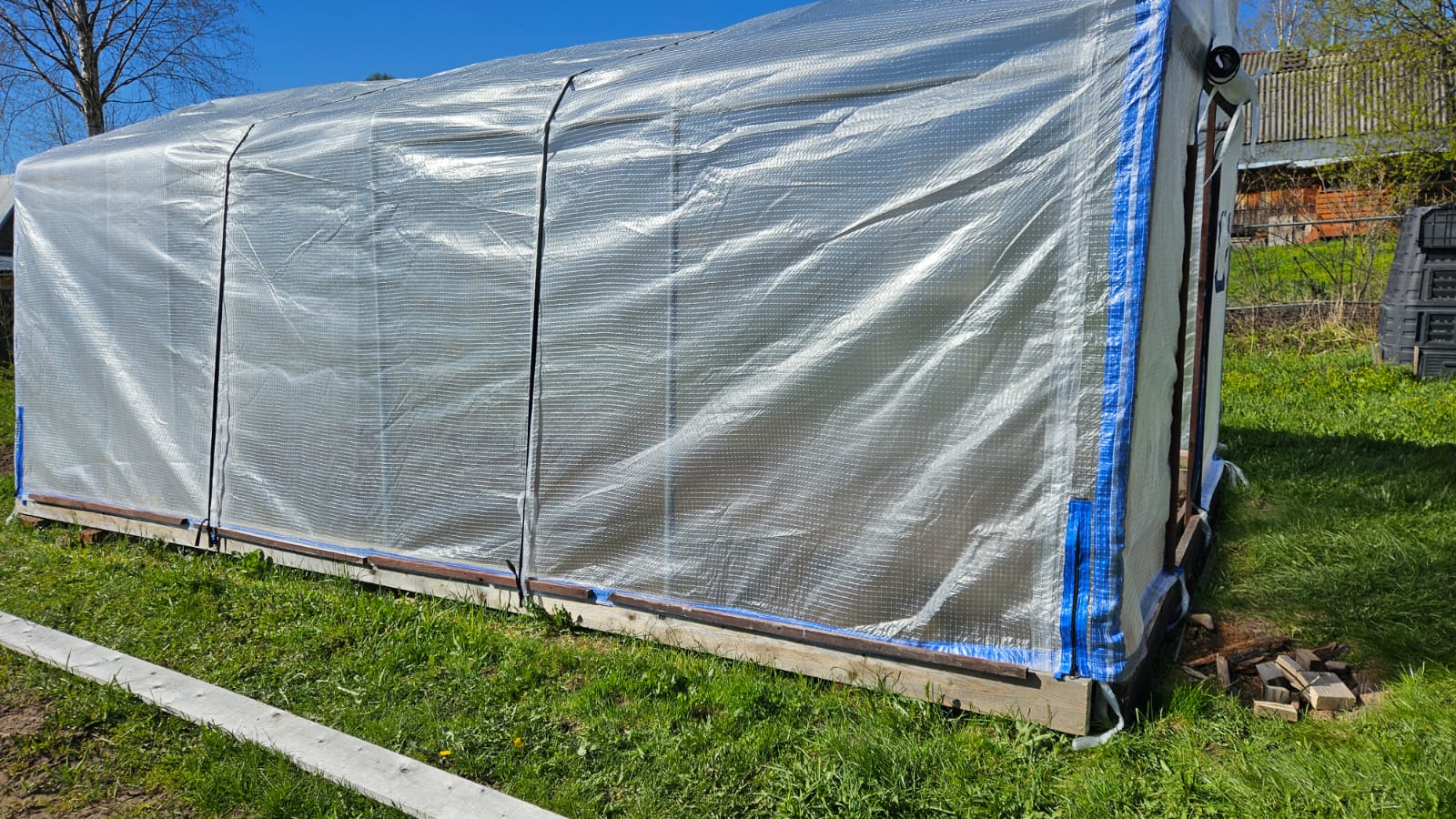По низу добавлен материал пленки, чтобы чехол доставал до земли. Но все равно мы рекомендуем обустроить низ теплицы фундаментом из бруса или толстой доски, чтобы было к чему крепить и прижимать чехол.